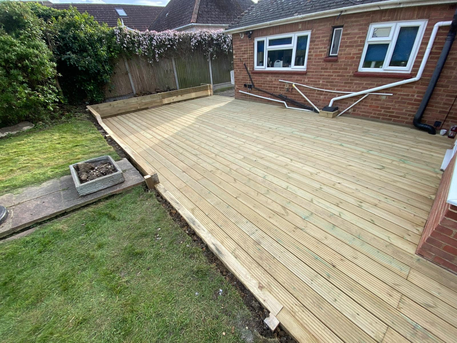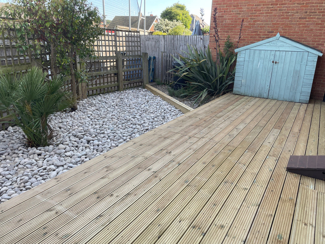 90m2 decking installation with a sleeper retainer and border.