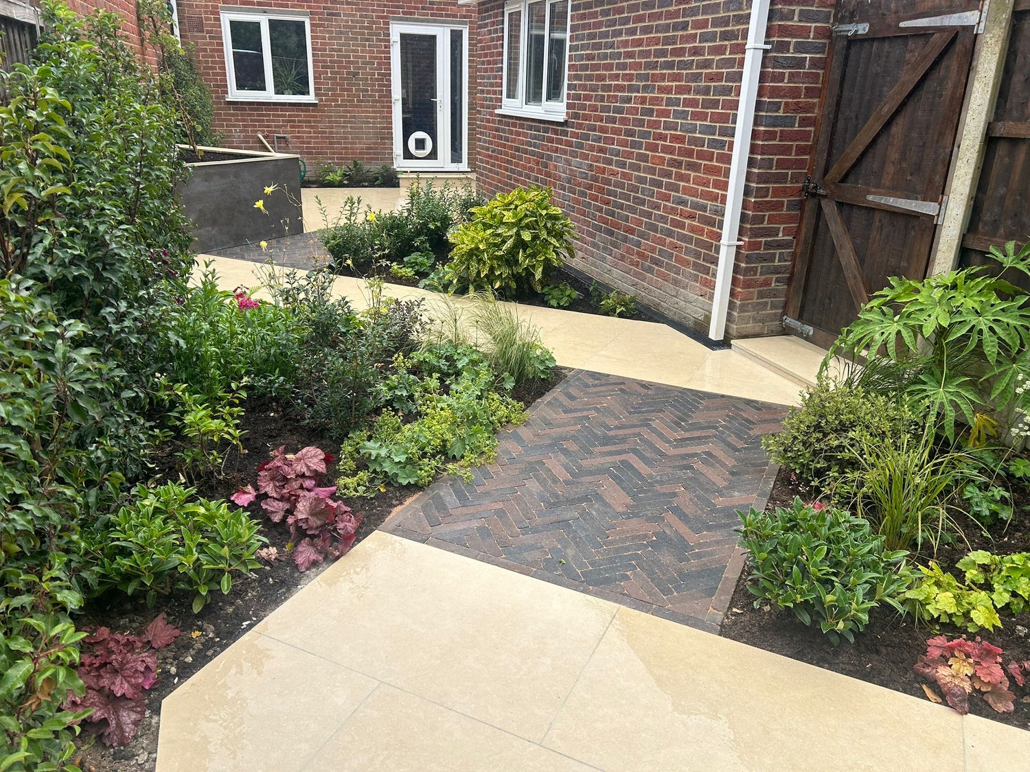Porcelain patio installation with clay pavers and a raised bed with plantin