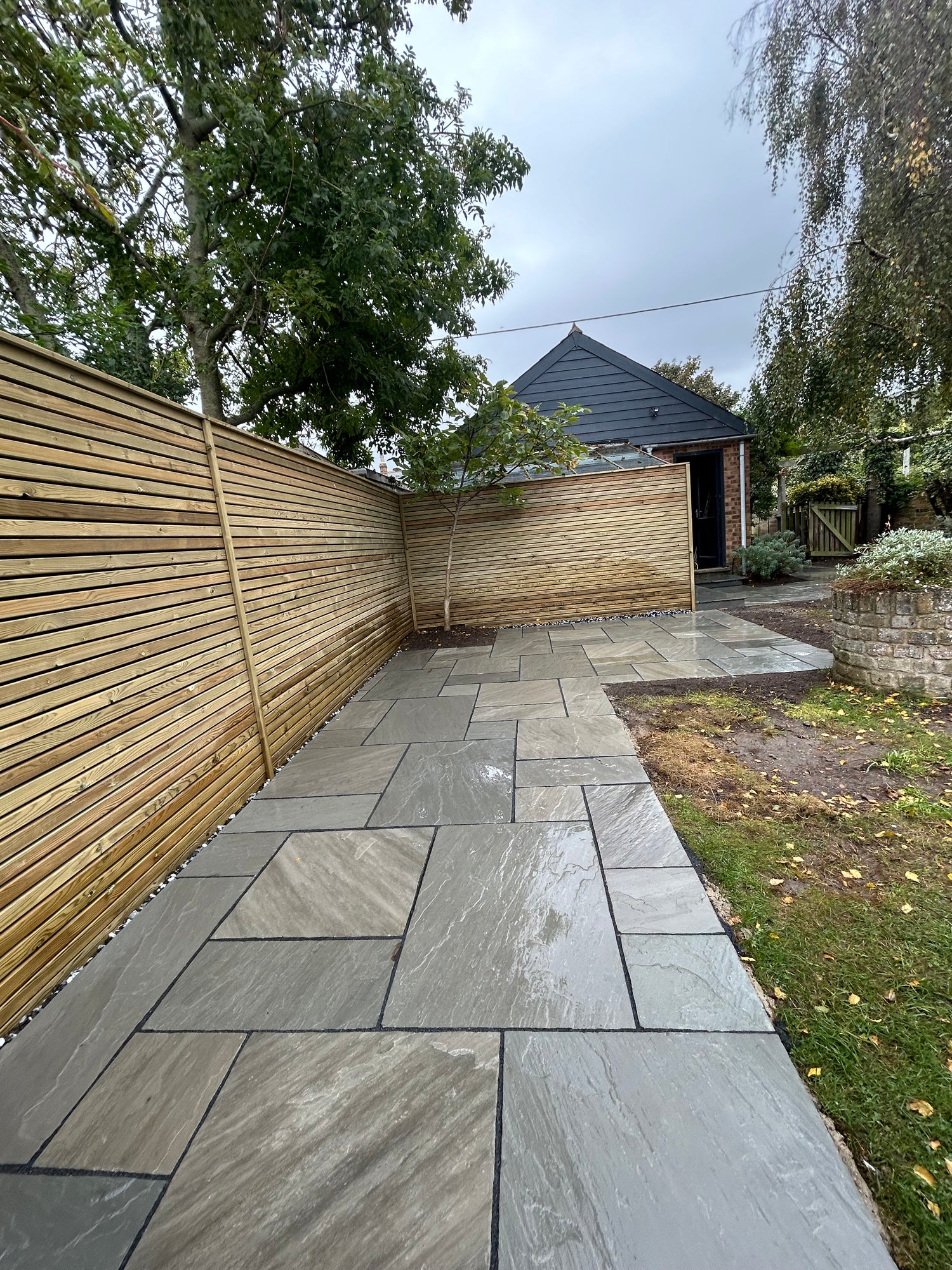 Kandla Grey Sandstone patio, with Venetian style fencing installation.