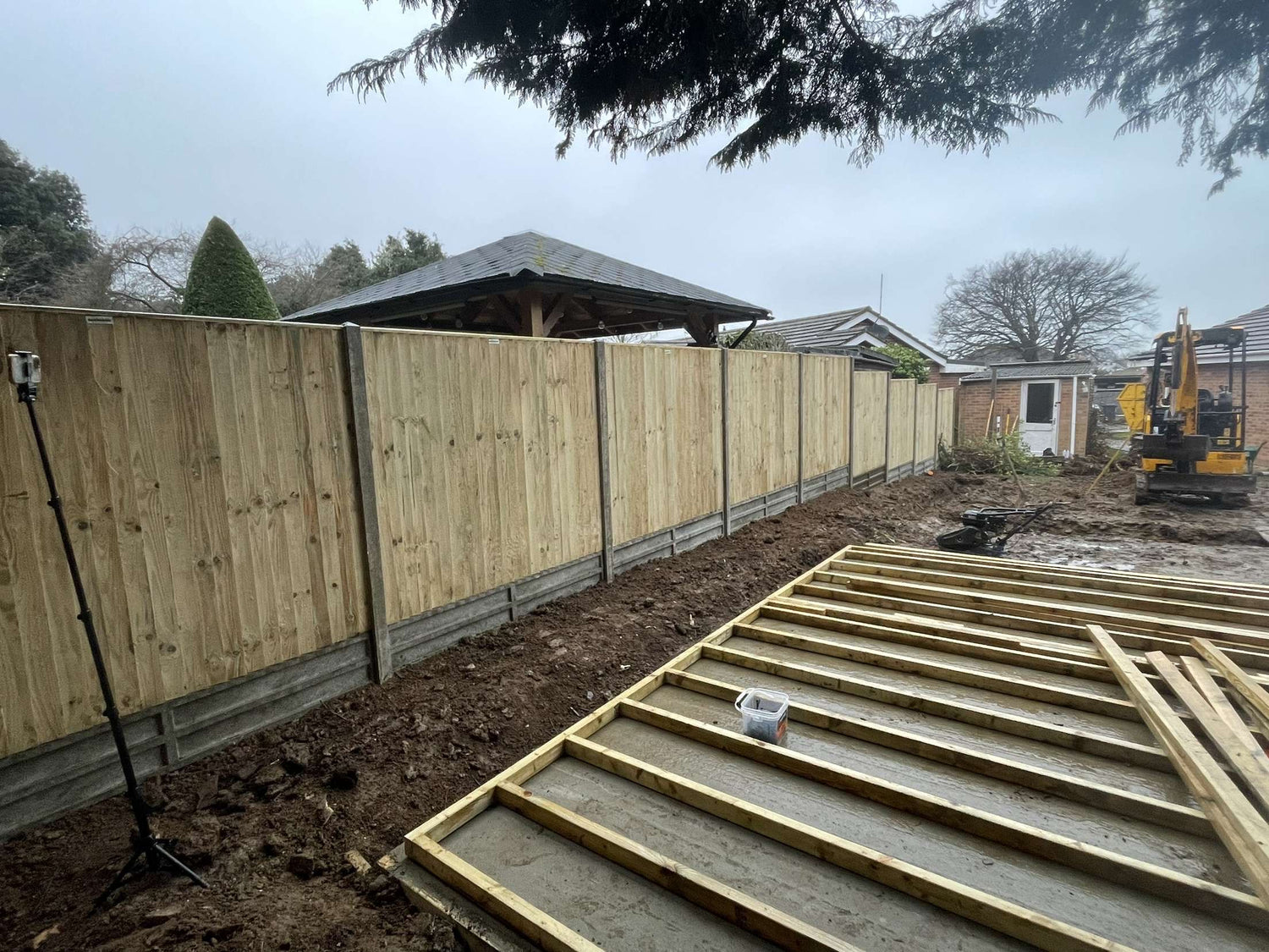 11 closeboard feather edge fence panels with concrete posts and gravel boards supplied and installed.