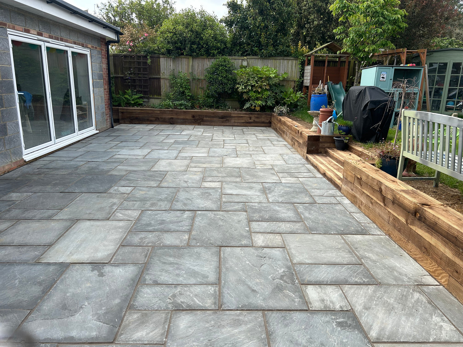 80m2 Kandla Grey Indian Sandstone patio installation with slip drainage and sleeper retaining walls.